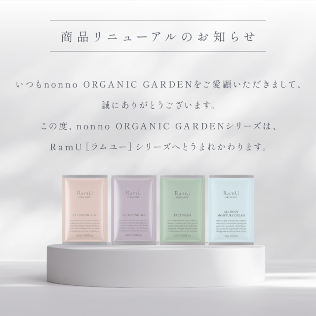 【nonnoリニューアル品】ラムユー オーガニック シリーズ パウチ 4点(クレンジング・ウォッシング・オールインワン・ボディクリーム)セット 台紙付き 100セット